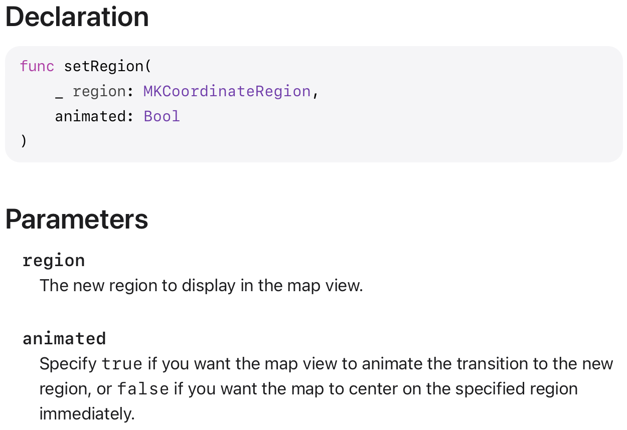 animated(true로 설정 시 새로운 지역으로 부드럽게 이동, false로 설정 시 즉시 이동) 타입은 Bool이다.