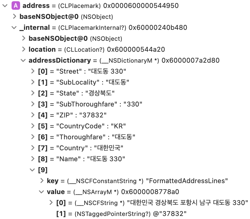 location에 위도와 경도로 이루어진 CLLocation값을 넣으면 변환 값이 completionHandler를 통해 들어오게 된다.