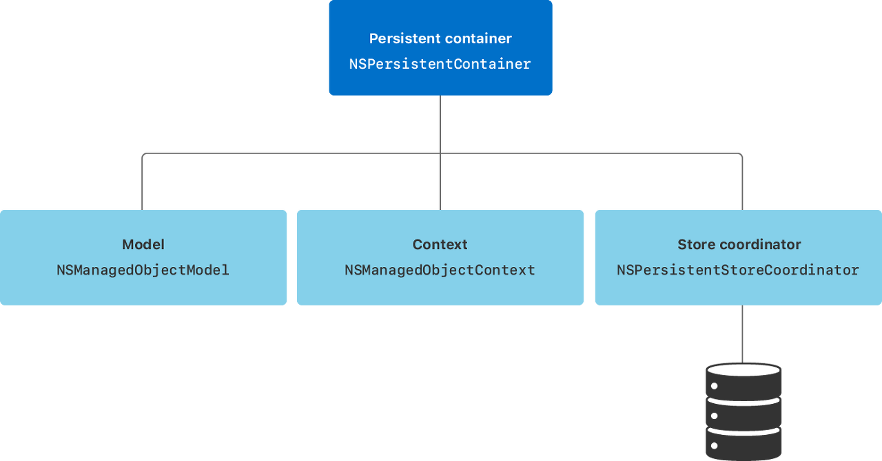 persistentContainer가 생성되면, 해당 저장소는 model, context, store coordinator 인스턴스에 대한 참조값을 가진다.